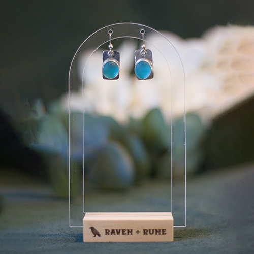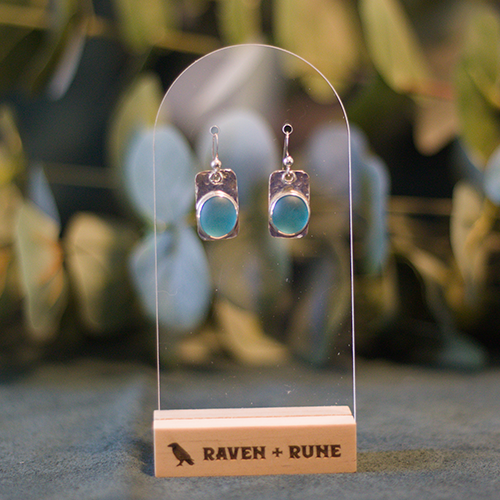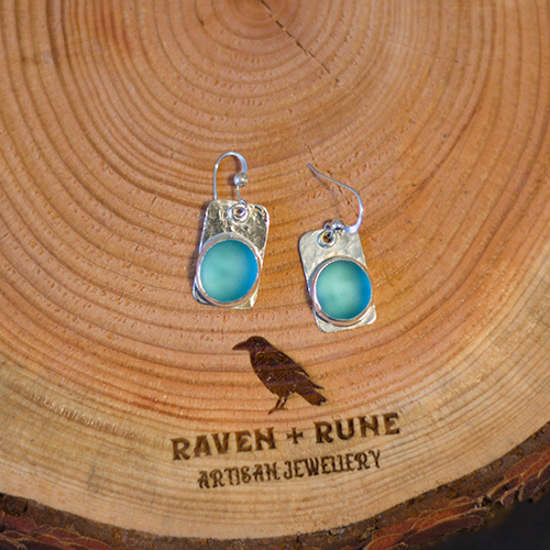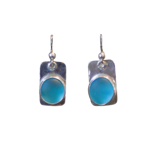These aqua blue seaglass earrings are set on hammered sterling silver.