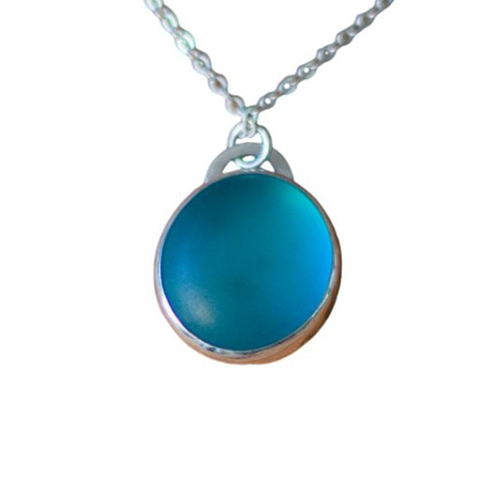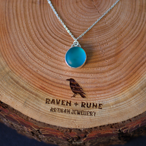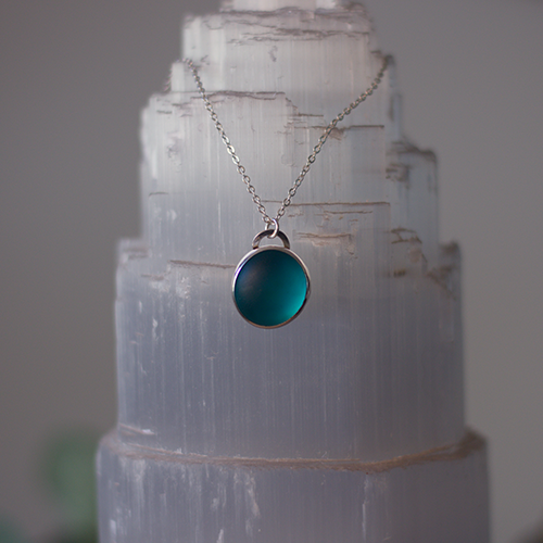 Rich turquoise seaglass set in sterling silver on a18 inch chain.